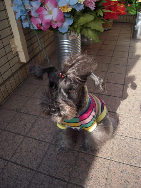 お店に居たお洋服穿いたワンコ。
